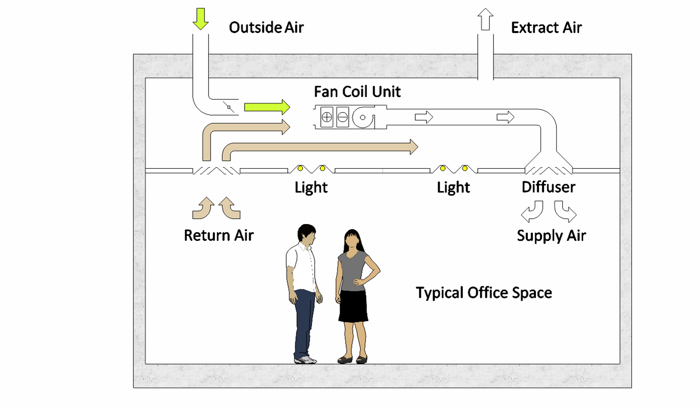 Primary ventilation is discharged into the ceiling void in close proximity to the return air intake of FCUs, which allows mixing with the return air. The temperature of this return air is sensed by the FCU controls and used to determine if there is a heating or cooling requirement, which in turn controls the water side control valves and hence flowrates. This is why the primary ventilation flowrate taken to FCUs is limited to circa 10% to 15% of the FCU air handling capability.