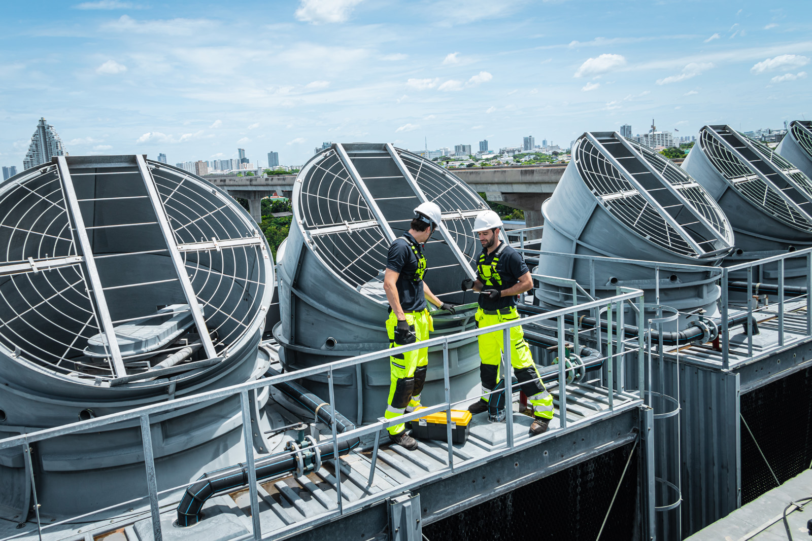 The speculative heating and cooling loads are met by either a variable refrigerant flow (VRF) type comfort heating and cooling system, which incorporates a multitude of indoor FCUs linked via refrigeration pipework to externally mounted condensing units, or more often than not, office buildings utilise 4-pipe FCUs in lieu of VRF based systems. This requires central plant in the form of boilers for low temperature hot water which may also incorporate Combined Heat and Power (CHP) plant and chillers, which provide chilled water.